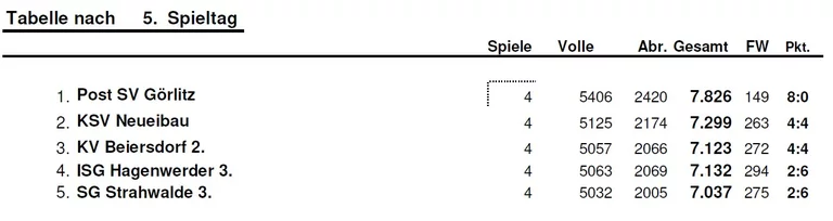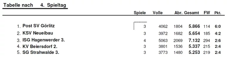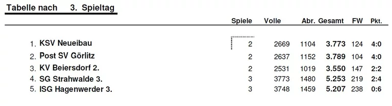 Aber es gibt auch positives zu berichten. Das Ergebnis des 4. Spieltages gegen den KV 99 Rodewitz/Hochkirch wurde nachträglich noch korrigiert. Es gab wohl Unstimmigkeiten beim Einsatz eines Spielers bei unserem Gegner und somit wurde sein Ergebnis gestrichen und der Sieg ging nachträglich an unsere 1. Mannschaft. Und auch unsere Mix-Mannschaft konnte am 3. Spieltag ihren ersten Saisonsieg einfahren. Die Begegnung gegen die Mannschaft des ISG Hagenwerder 3 wurde mit 1768:1678 gewonnen. Herzlichen Glückwunsch zur geschlossenen Mannschaftsleistung.